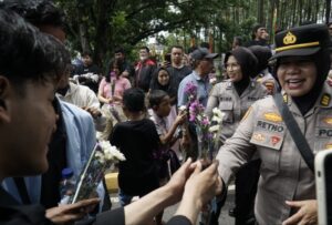 Pekanbaru,Gelarnews.com – Bertepatan di Hari Ulang Tahun (HUT) ke-77, Polwan Polda Riau melakukan aksi humanis dalam mengamankan demo di depan gedung DPRD Riau. Sejumlah polwan membagi-bagikan bunga kepada mahasiswa yang menggelar aksi.