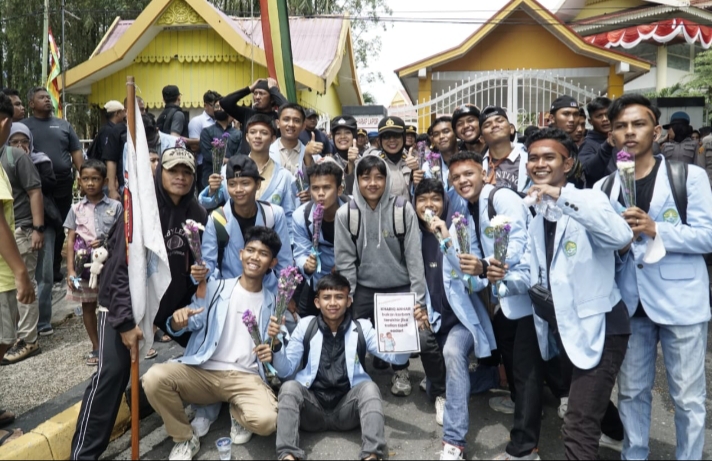 Momen ini terjadi di tengah aksi mahasiswa menggelar demo di depan gedung DPRD Provinsi Riau, Jalan Sudirman, Tengkereng Selatan, Kota Pekanbaru, Senin (1/9/2025) siang tadi. Para mahasiswa menyambutnya dengan senyuman.